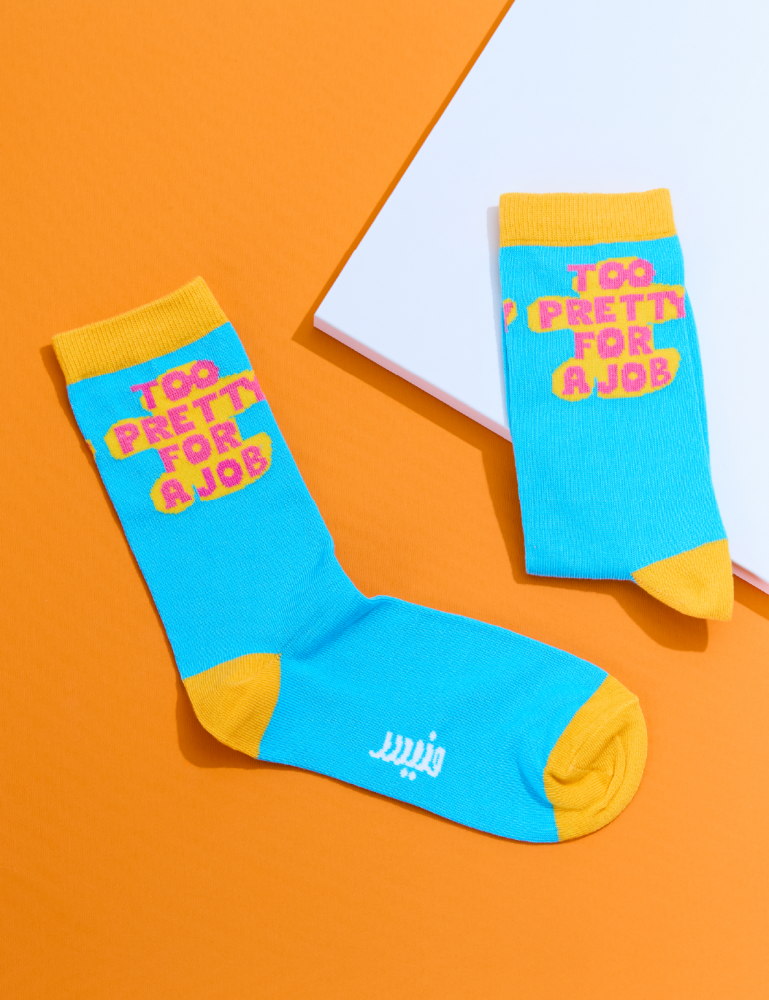 يتميز بلون أزرق فاتح مع تفاصيل باللون الأصفر، بعبارة “TOO PRETTY FOR A JOB”.