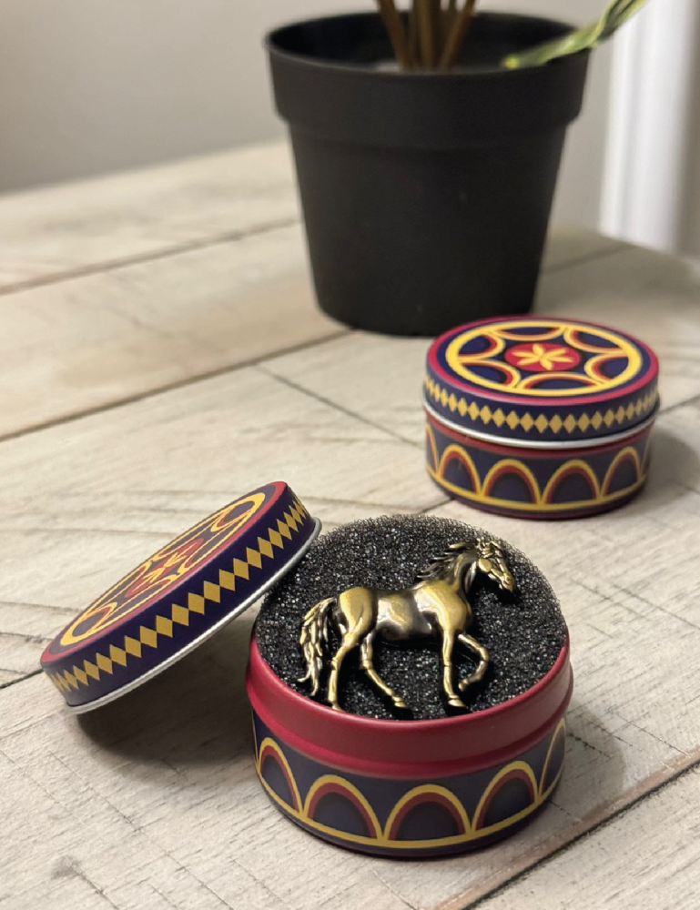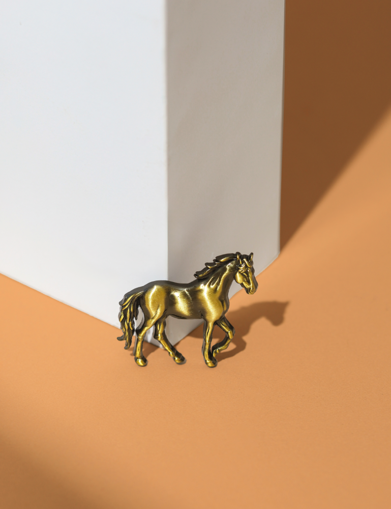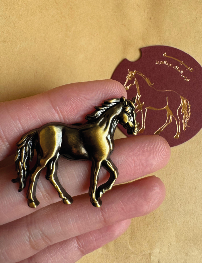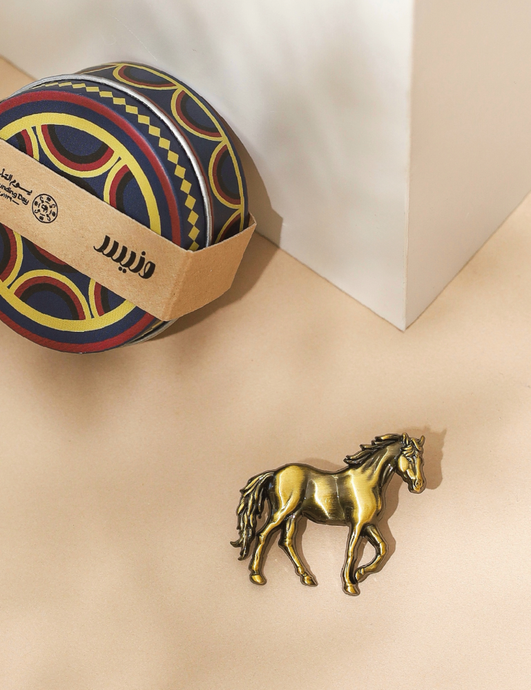 صمم البروش بتجسيد فرس ثلاثي الابعاد مقتبسا من هوية يوم التأسيس