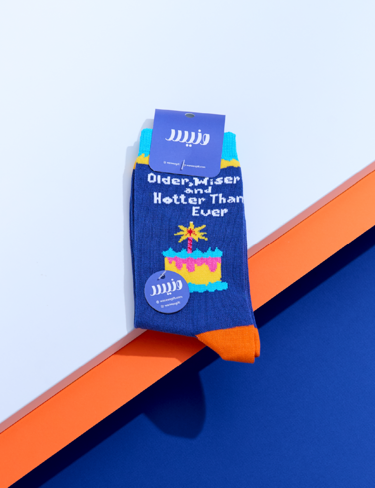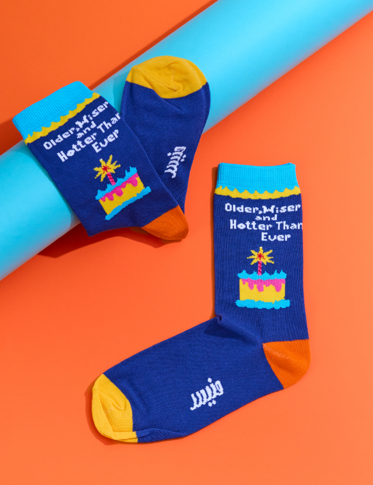 يأتي بلون أزرق مع تفاصيل باللون الأصفر والبرتقالي، ورسمة مع عبارة “Older, Wiser and Hotter Than Ever”.