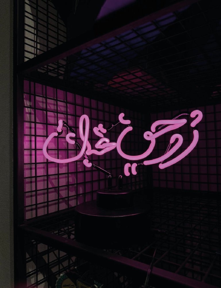 أنبوب زجاجي نيون مُشكل على جُملة (روحي تحبك). أنابيب زجاجية نيون هي عازمة ومثبّتة على قاعدة أسطوانية من أجل عرض أنيق. يتم توصيله بمحول مضمن + يتم تشغيله باستخدام مفتاح يسهل الوصول إليه في القاعدة.